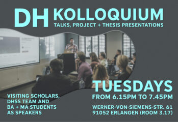 Das Kolloquium dient den Forschenden des DHSS und ihren Gästen sowie BA- und MA-Studenten der Digital Humanities dazu, ihre laufende Arbeit aber auch abgeschlossene Projekte vorzustellen, an Diskussionen teilzunehmen und Feedback von Kollegen und Gleichgesinnten zu erhalten.
